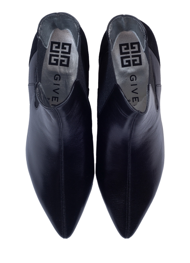 - Кожаные ботильоны челси на маленьком каблуке. Верх имеет высоту примерно 165 мм. Замшевые детали сзади. По бокам эластичные вставки.