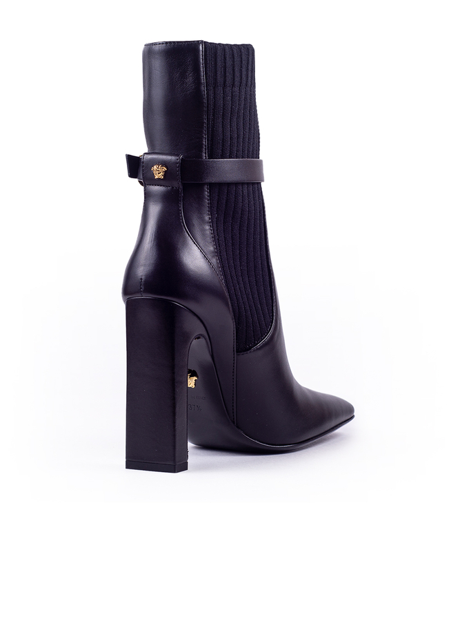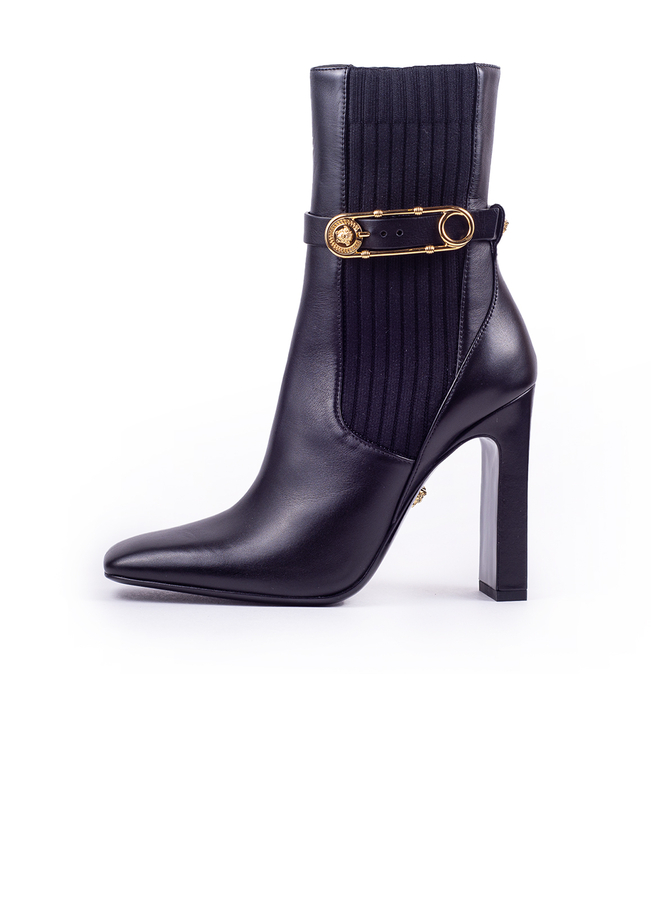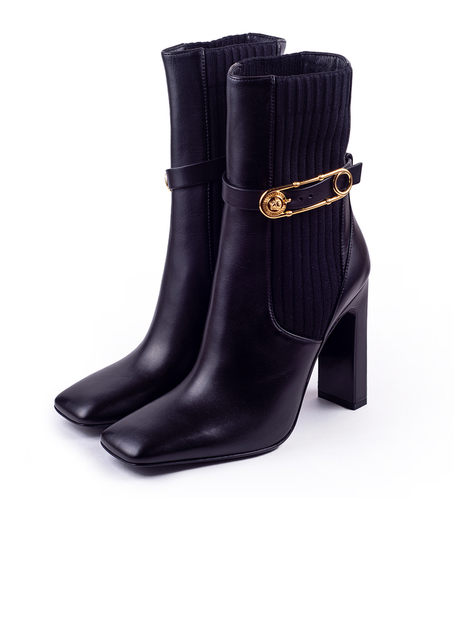 - Черные ботильоны с квадратным носом. Модель на высоком устойчивом каблуке из гладкой мягкой кожи. Декор с ремешком, украшенным большой брошью Safety Pin в виде английской булавки и миниатюрной горгоны Медузы. Эластичные трикотажные панели по бокам.