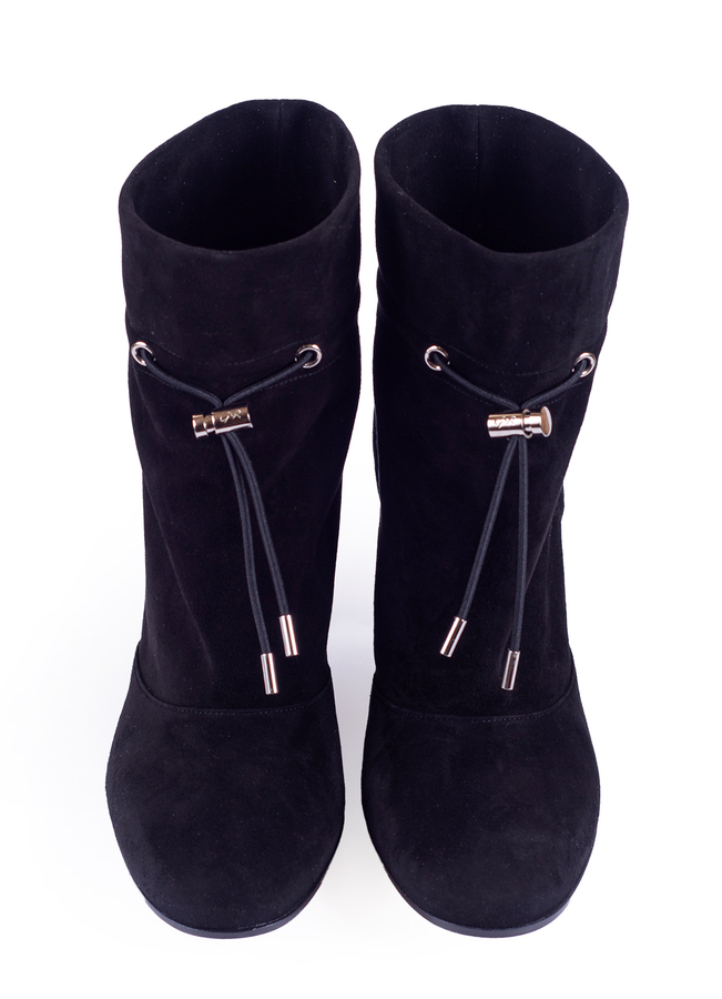 - Женские ботильоны из замшевой кожи. Модель украшена блочным каблуком 8,5 см и регулируемой кулиской на щиколотке. Металлические детали с логотипом бренда.