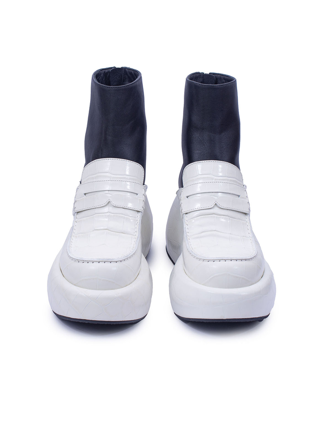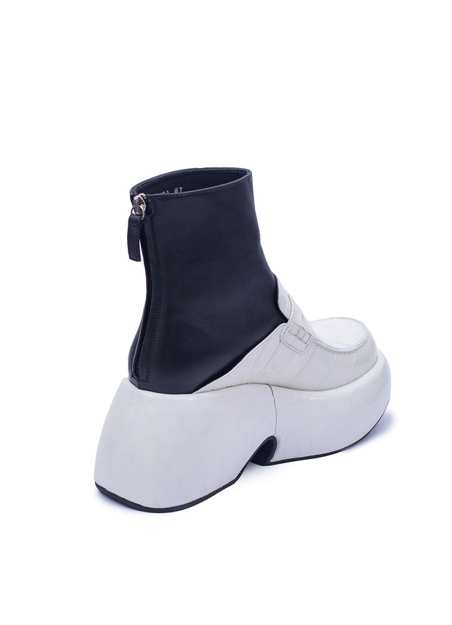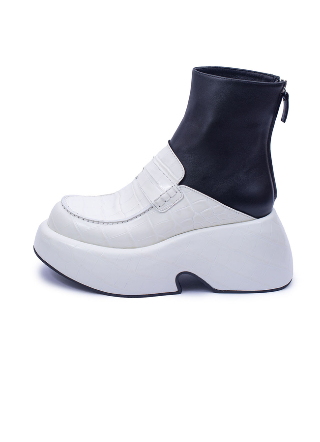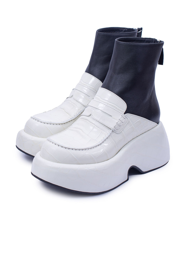 - Кожаные ботинки-лоферы с тиснением под крокодила, на массивной резиновой подошве. Застежка на молнии сзади.