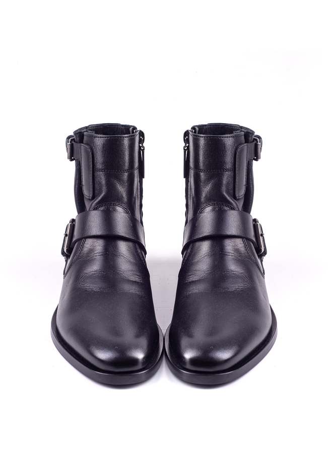 - Черные кожаные ботильоны Matt 10 из кожи. Модель с тупым мыском, боковыми пряжками, боковой молнией, стелькой с логотипом и низким каблуком.