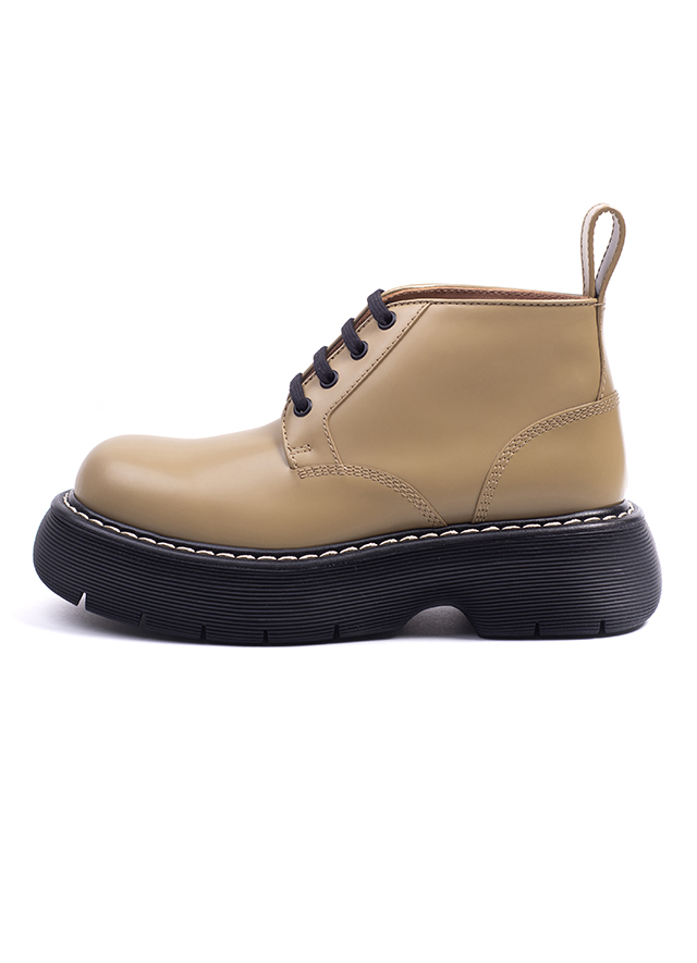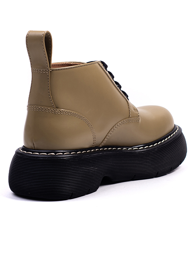 - Кожаные ботинки на массивной контрастной подошве. Контрастная строчка, закругленный носок, петля для подтягивания сзади, на шнуровке.