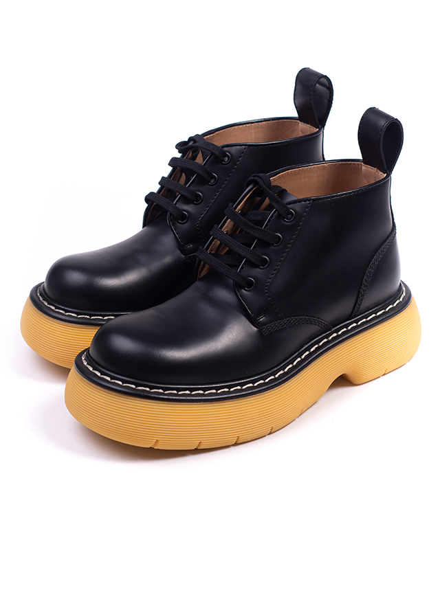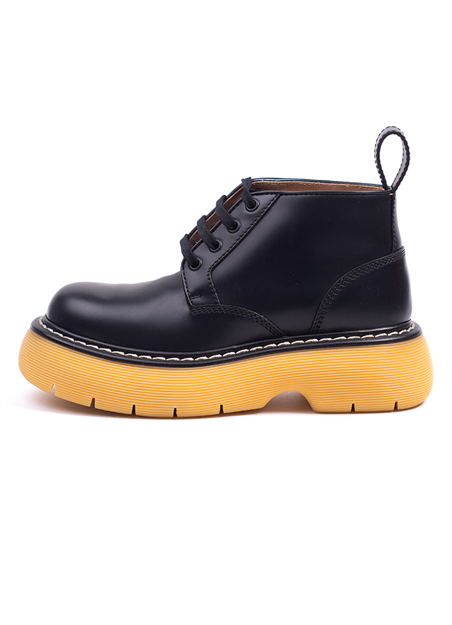- Кожаные ботинки на массивной контрастной подошве. Контрастная строчка, закругленный носок, петля для подтягивания сзади, на шнуровке.
