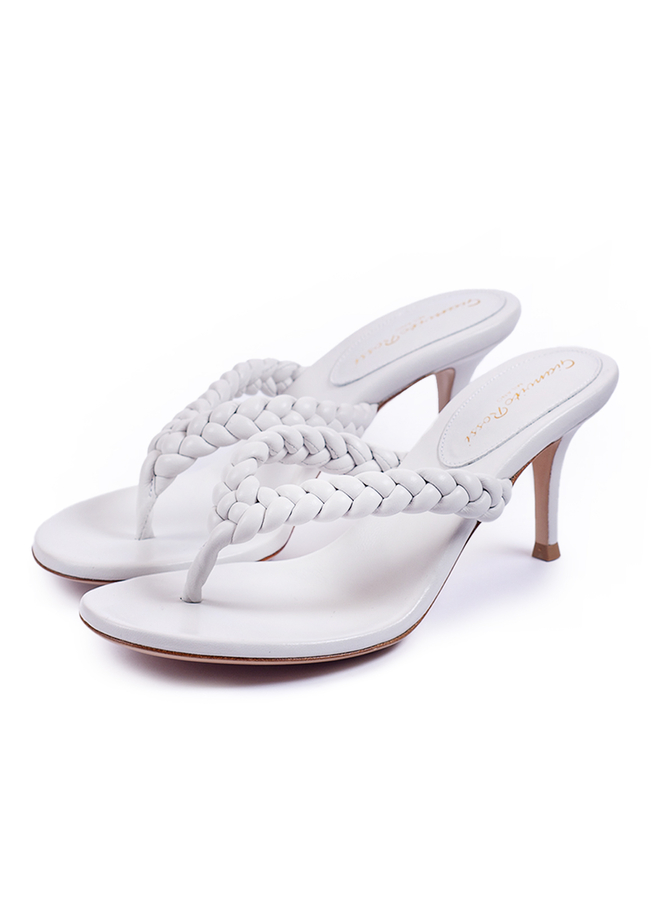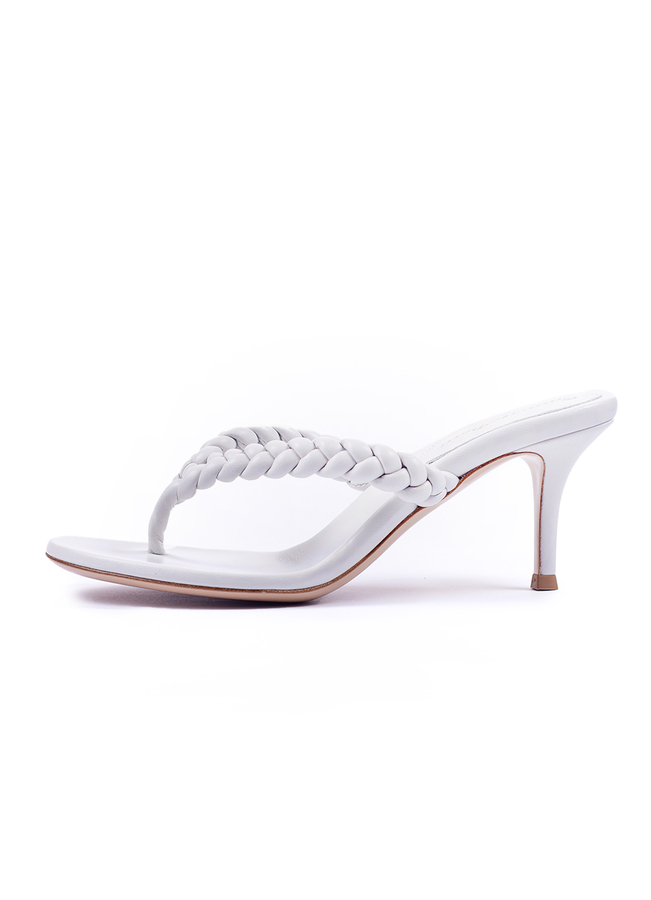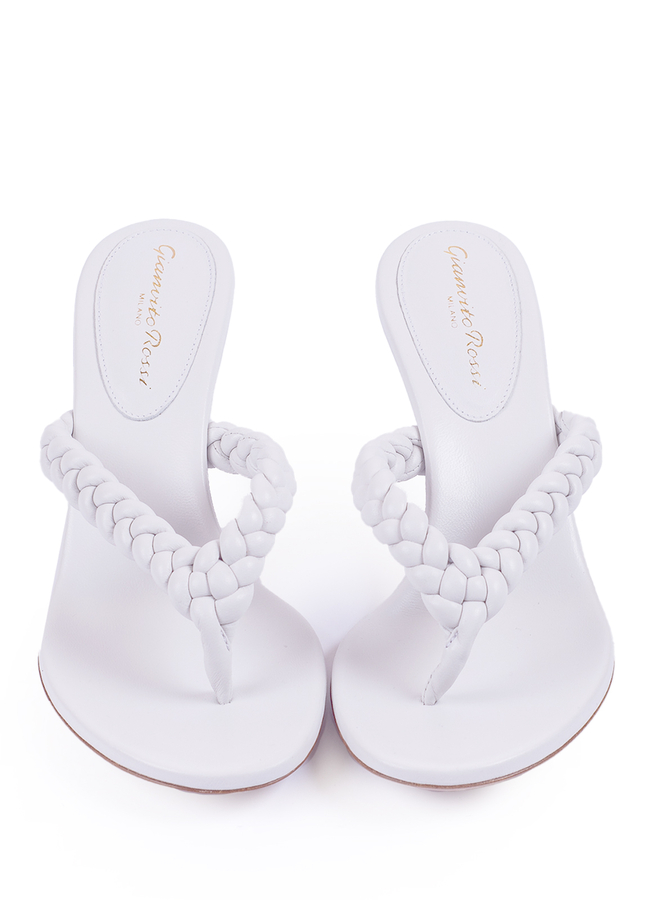 - Мюли из кожи с круглым носком и Y-образной плетеным ремешком, каблук на шпильке средней высоты. Модель из мягкой кожи.