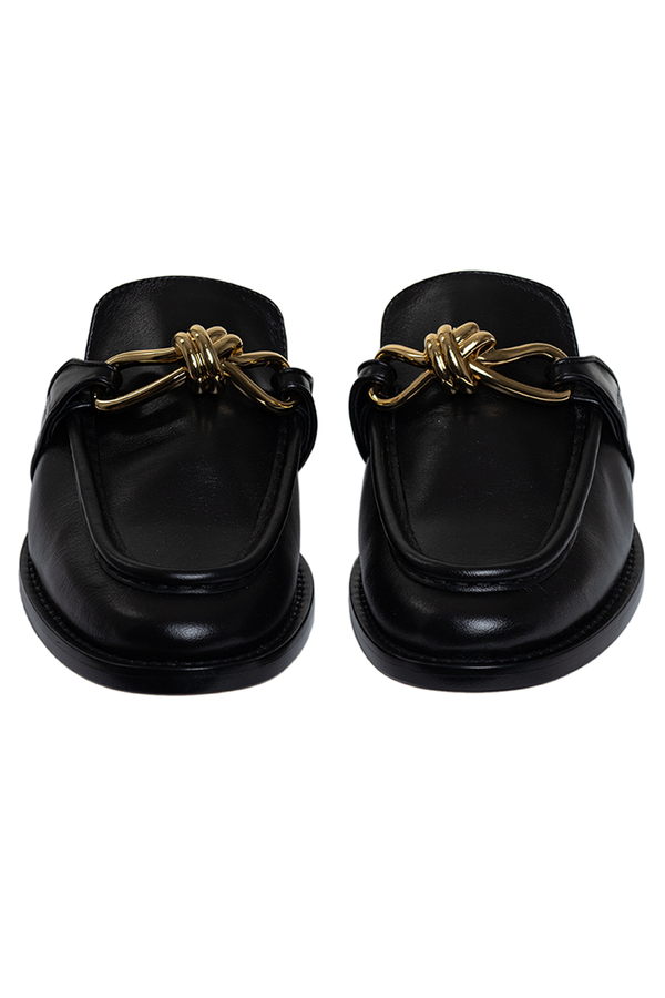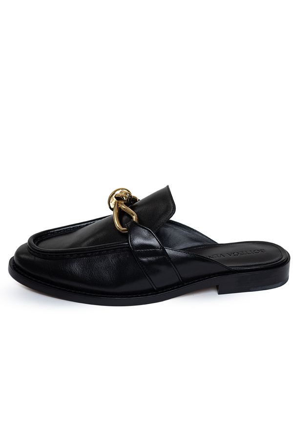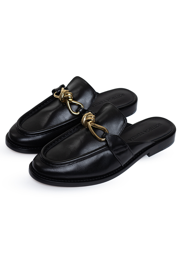 - Мюлі з закругленим носком, відкрита п'ята, металевий вузол спереду, фірмова устілка