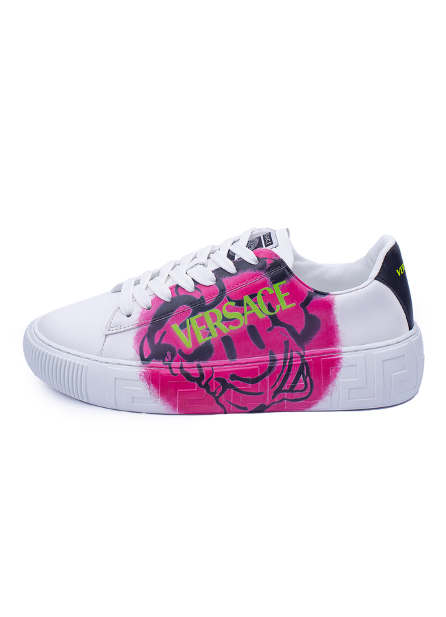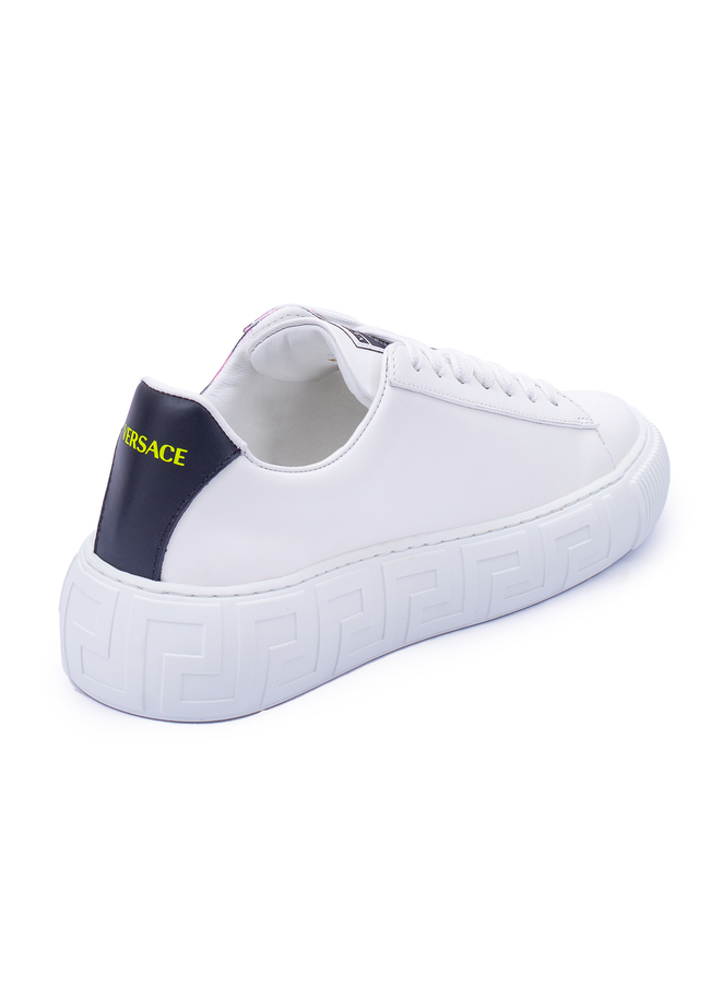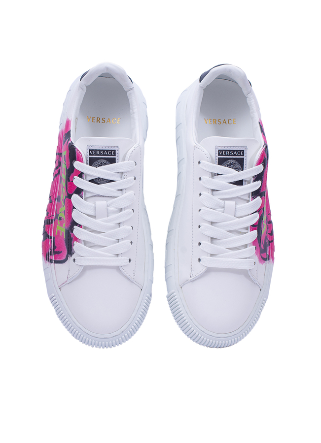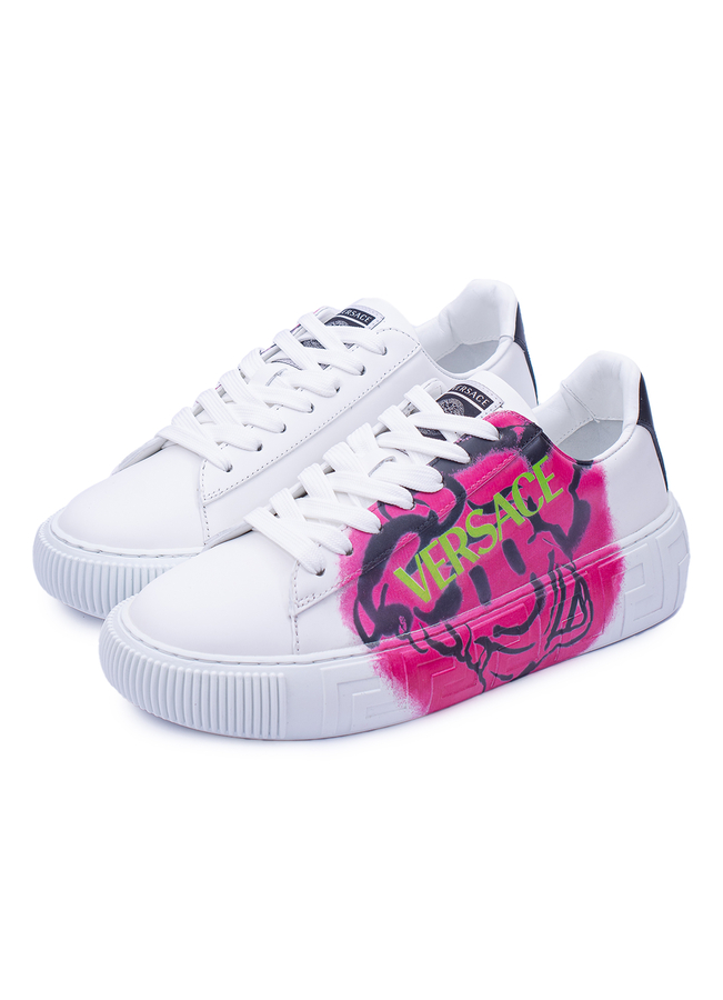 - Кожаные кроссовки с логотипом Greca с принтом медузы по бокам. На шнурках и высокой подошве.