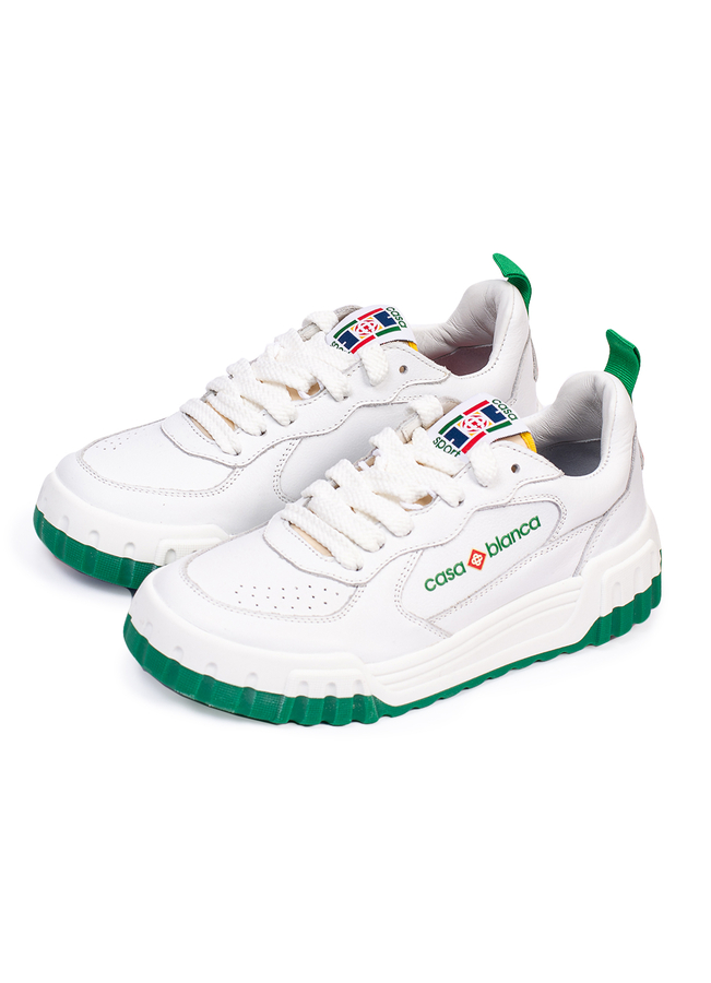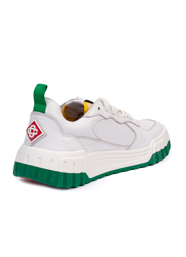 - Белые кроссовки на шнуровке, спереди перфорация, резиновая подошва со вставкой зеленого цвета, на языке и по бокам фирменный логотип