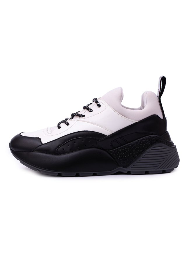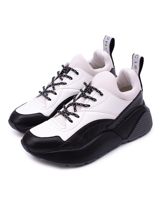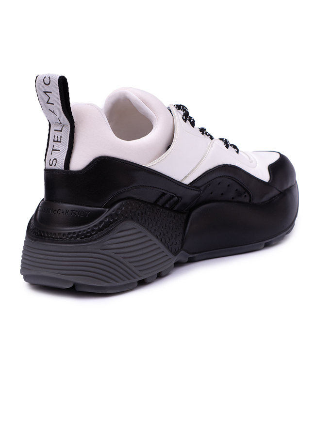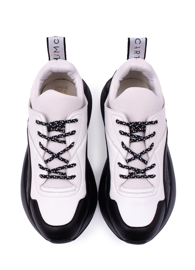 - Черно-белые кроссовки на массивной подошве. Выдвижная вкладка сзади, круглый носок, двойное крепление на сенсорном ремешке, разноцветный принт с логотипом, разноцветная резиновая подошва.