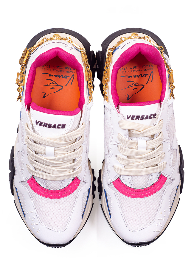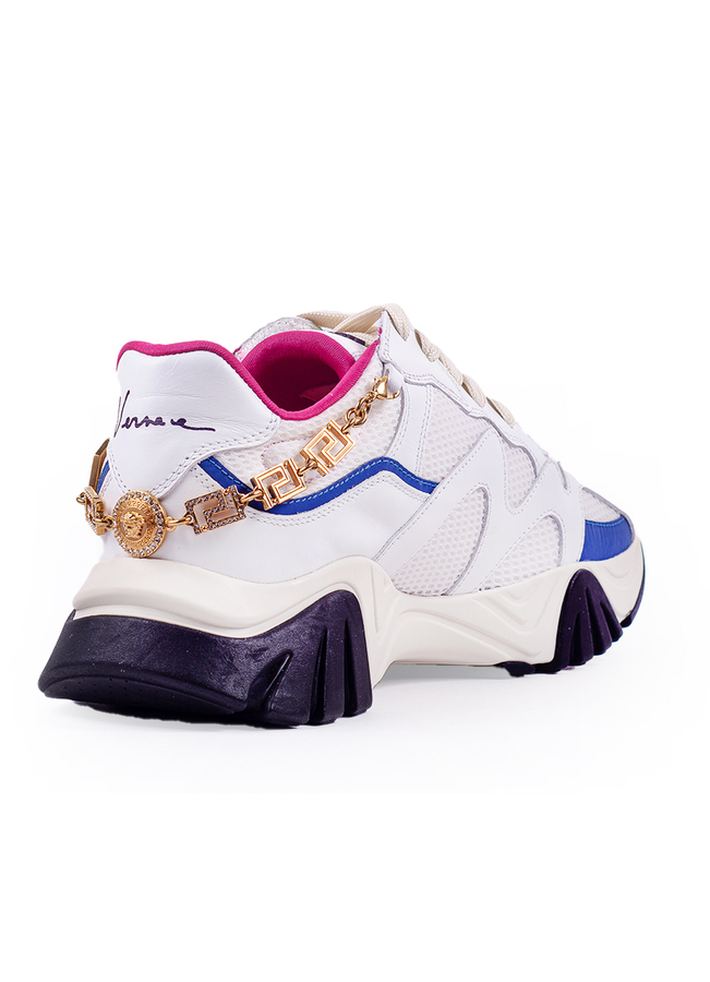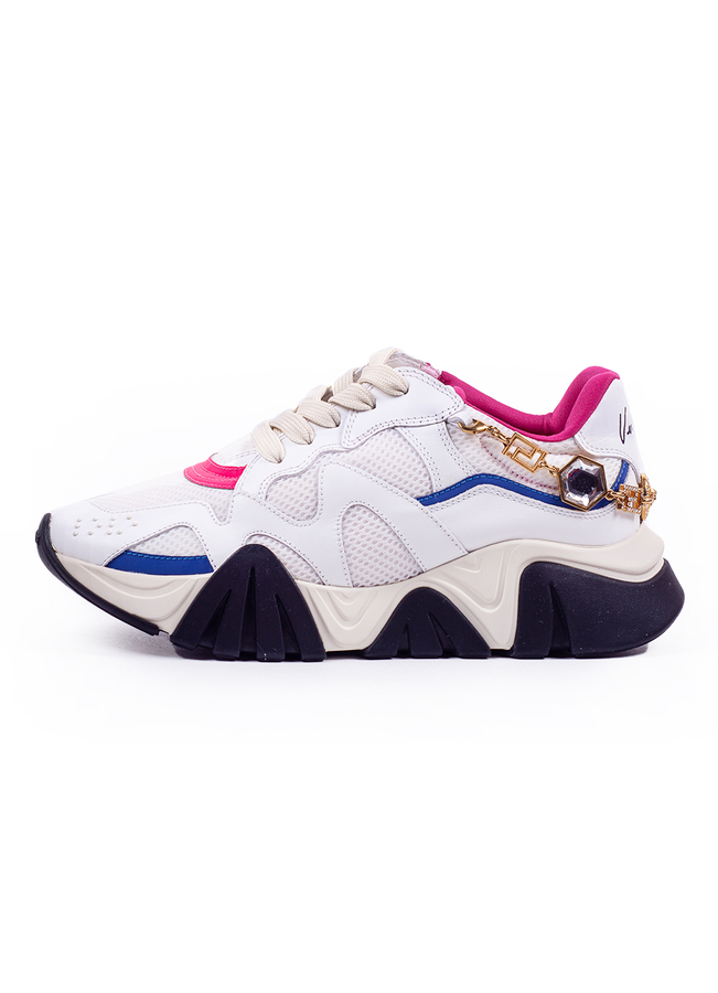 - Белые кроссовки Squalo выполнены из сетчатого текстиля и матовой кожи, с позолоченной цепочкой на заднике. Закругленный носок, массивная резиновая подошва, дизайн колор-блок, шнуровка впереди, панели в сетку, заплатка с логотипом на язычке и фирменный дизайн каблука.