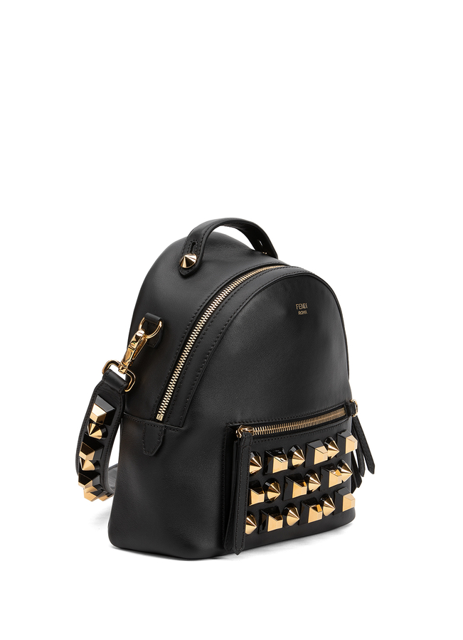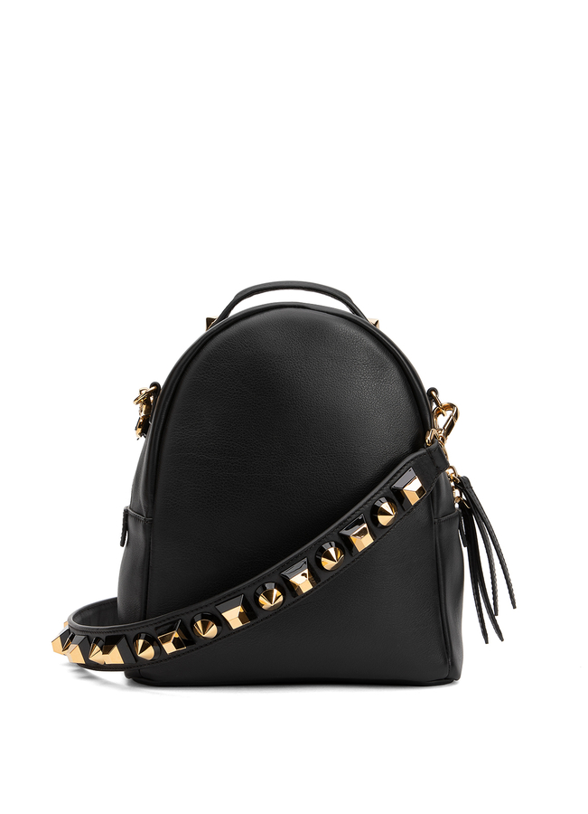 - Кожаный рюкзак на длинном плечевом ремне, с накладными карманами на молнии. Декорирован металлическими золотистыми пирамидами.