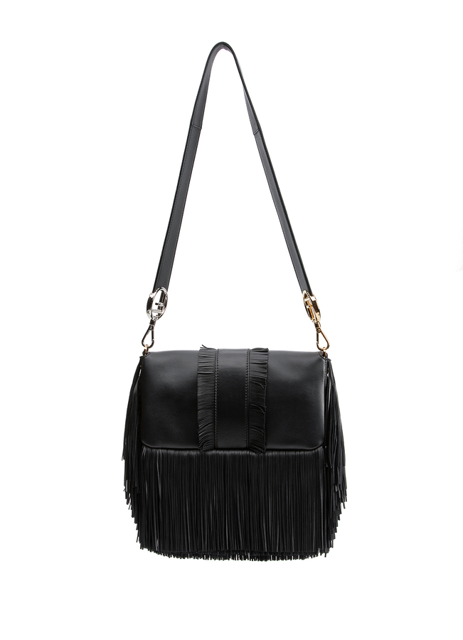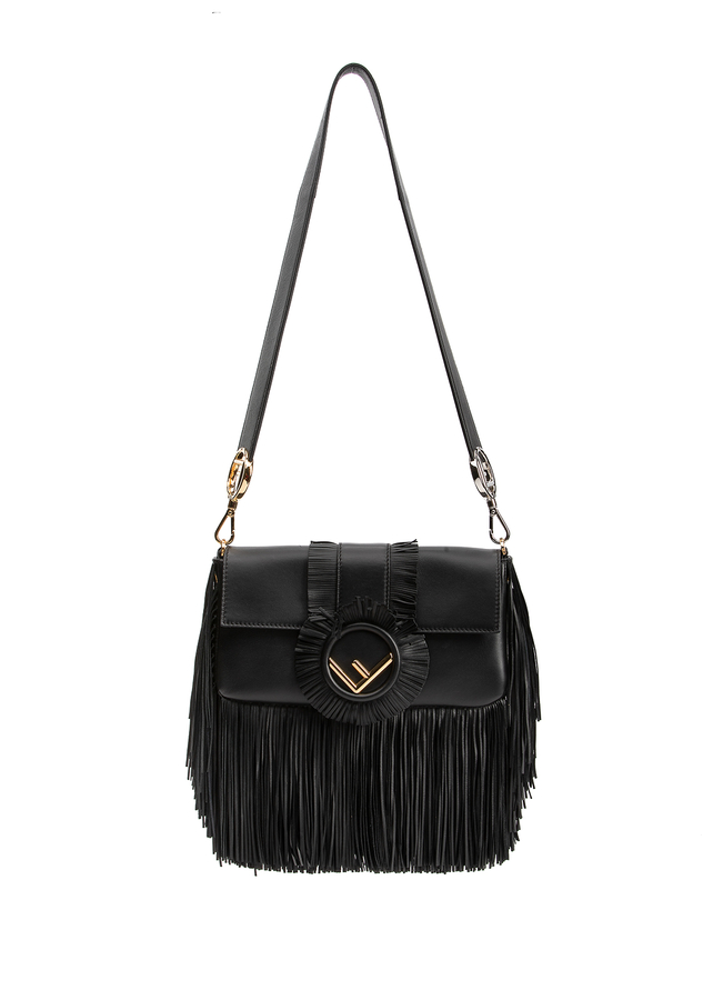 - Кожаная сумка Baguette с широким ремнем через плечо. Застежка на откидной верхний клапан. Украшена кожаной бахромой по бокам и металлическим логотипом с буквой F.
