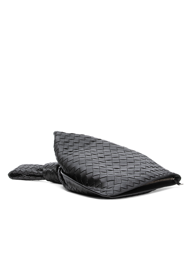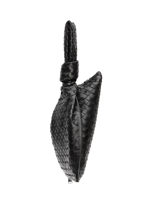 - Новый мешок-сумка, сплетенный вручную из кожи наппа, с непринужденной завязанной ручкой, которую можно надеть на запястье. Застежка на молнии внизу сумки.