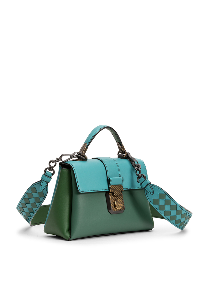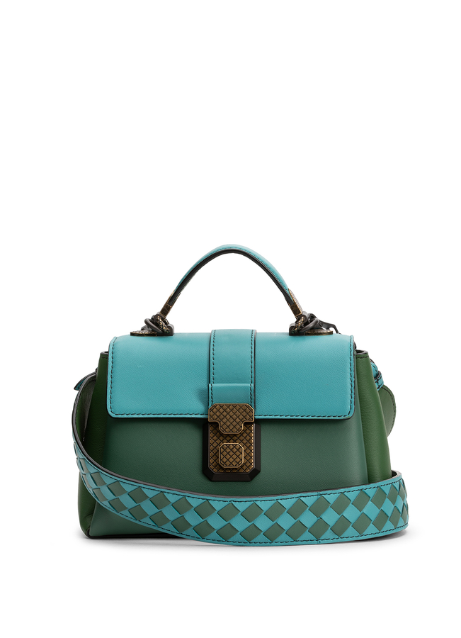 - Кожаная мини-сумка Bottega Veneta. Содержит съемный и регулируемый плечевой ремень, верх откидывающейся с застежкой на защелку, верхнюю ручку, основной внутренний отсек, подложку из замши, фурнитура золотистого цвету с эффектом состаривания и плечевой ремень intrecciato.