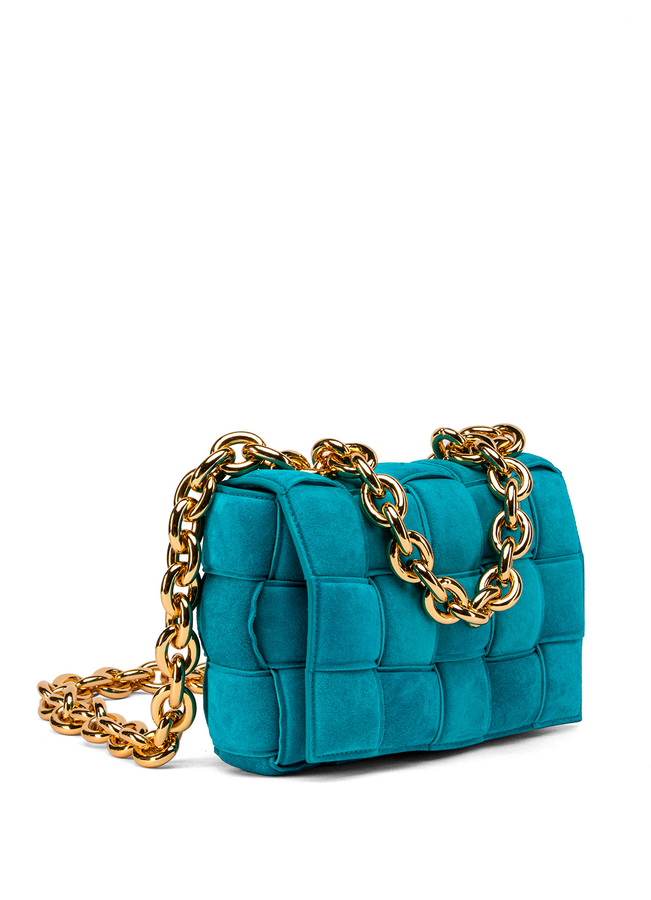 - Сумка The Chain Cassette с откидным верхом на магнитном креплении, внутренний карман на молнии, фурнитура золотистого цвета, ремень-цепочка на плече.