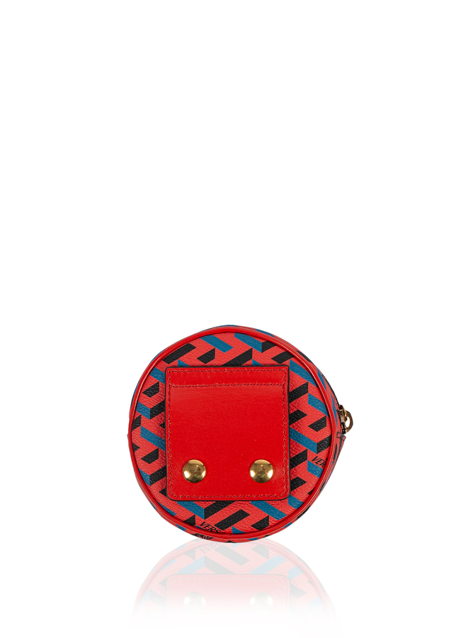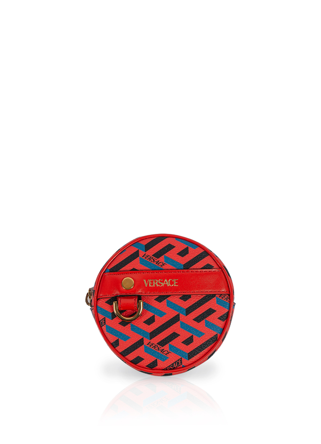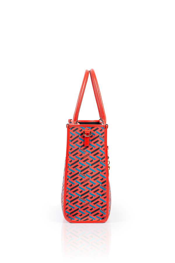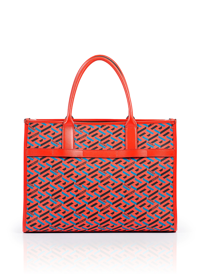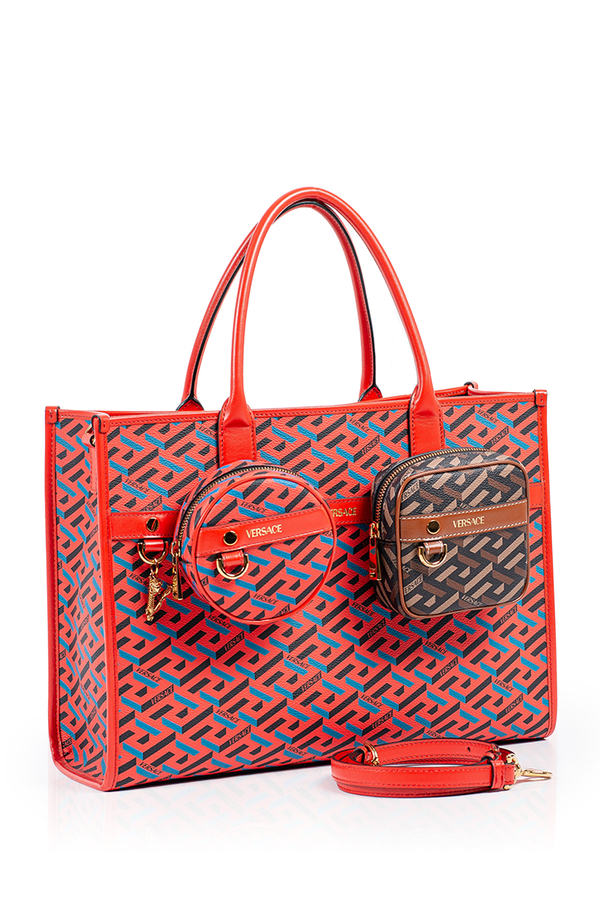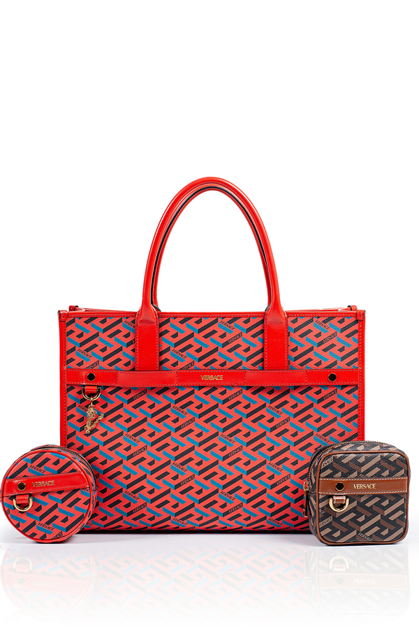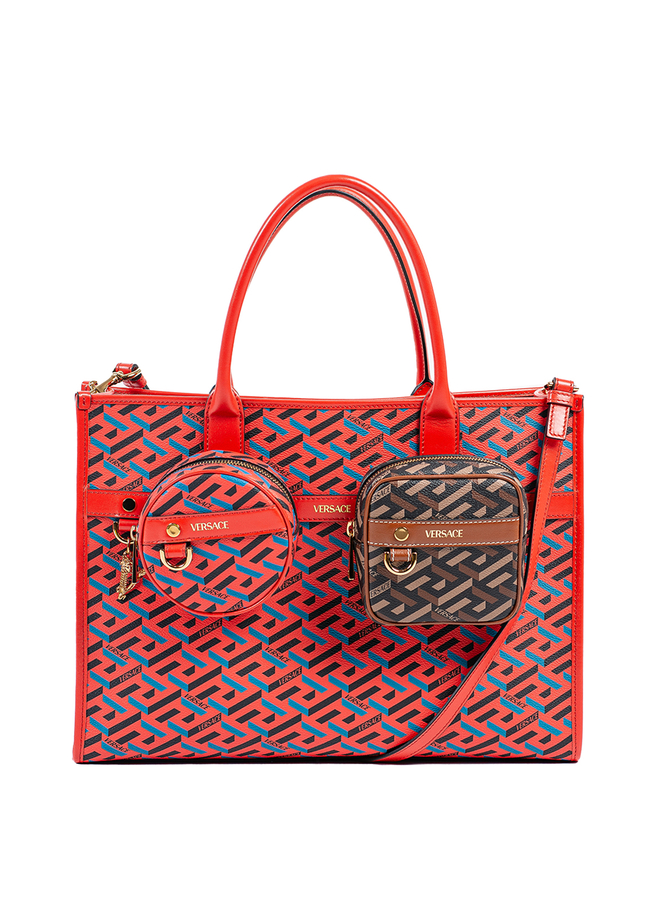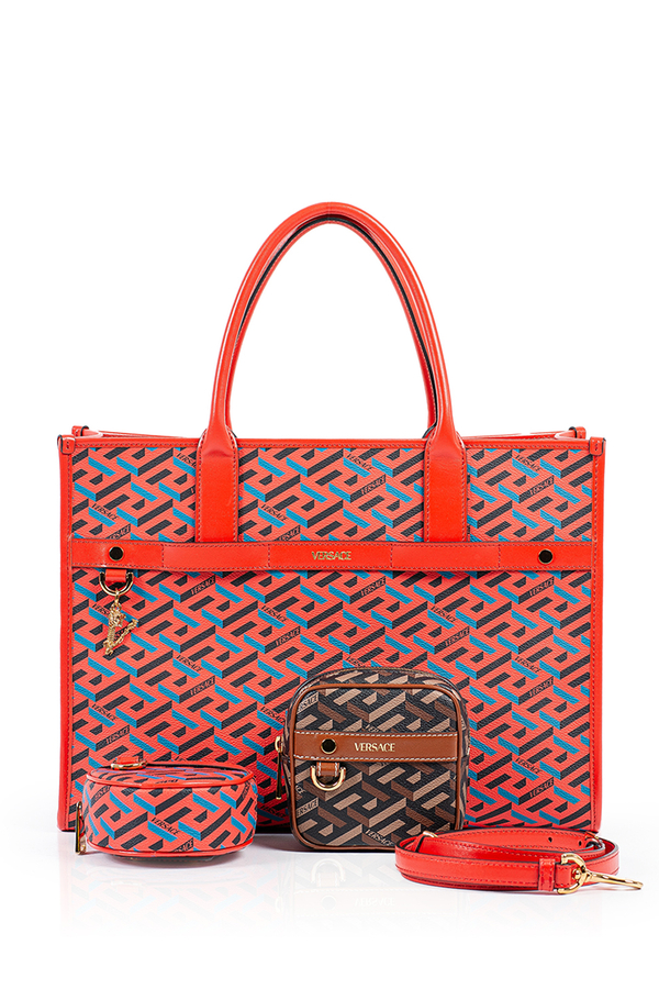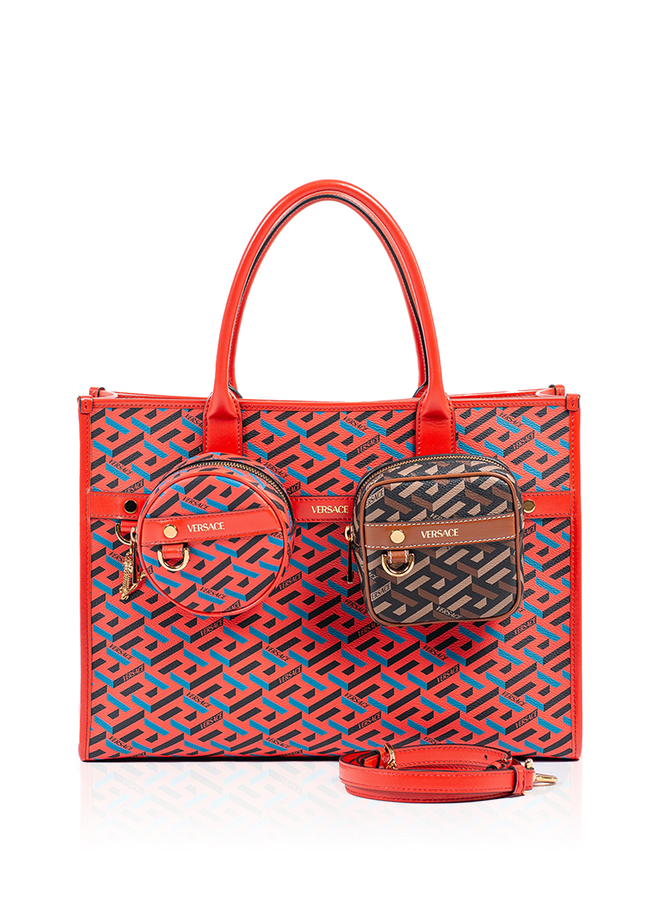 - Прямокутна сумка-тоут La Greca Signature з текстилю з орнаментом La Greca. М'яка обробка зі шкіри теляти, золотиста фурнітура, дві закруглені ручки, застібка на кнопках, знімний регульований ремінь на плече, основне відділення і знімний клатч.