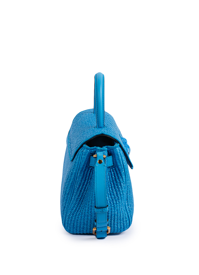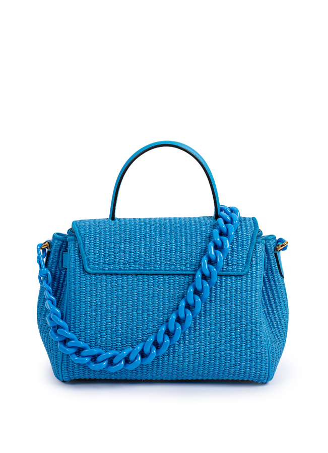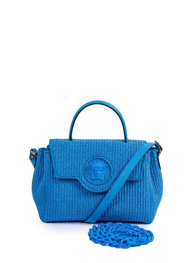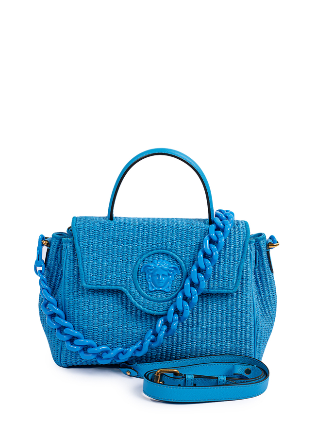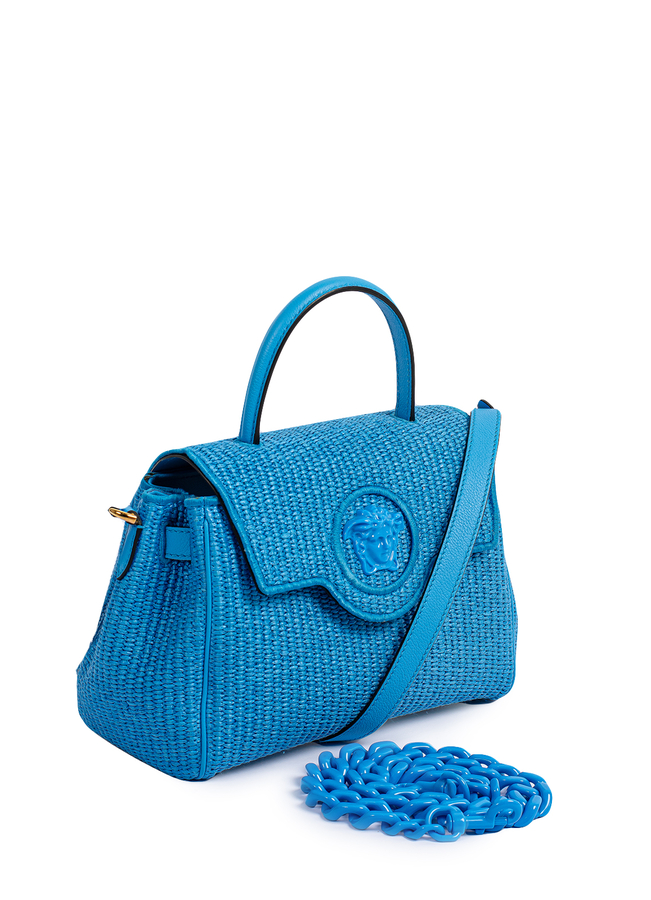- Сумка із плетеної тканини з обробкою зі шкіри. Оздоблена декором Medusa. Верхній відкидний клапан з застібкою. Прикрашена ланцюжком. Фурнітура золотистого кольору.