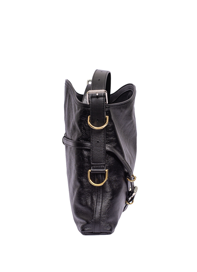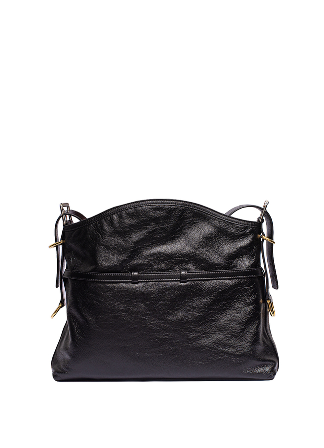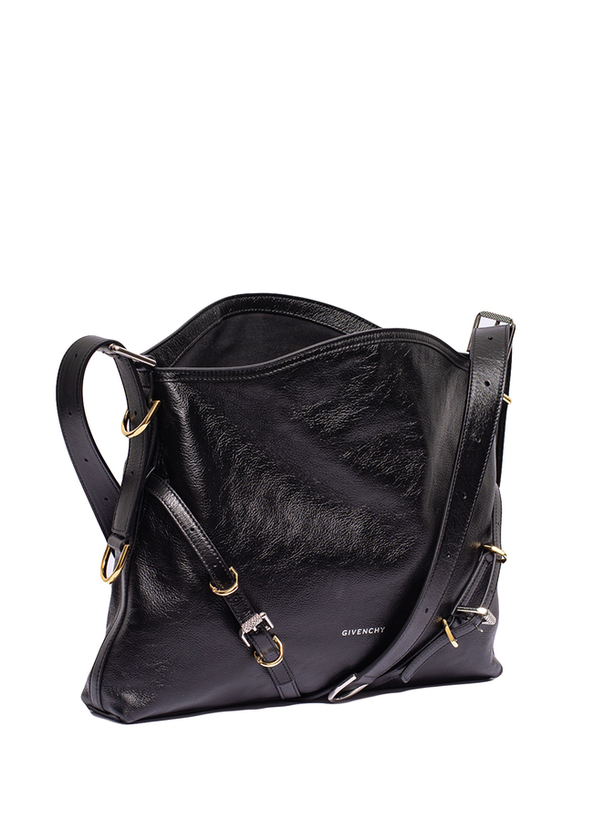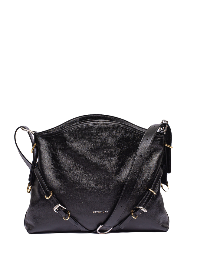 - Черная кожаная сумка Voyou с одним основным отделением и одним внутренним карманом на молнии, съемная регулируемая ручка, принт логотипа, металлические пряжки GIVENCHY
