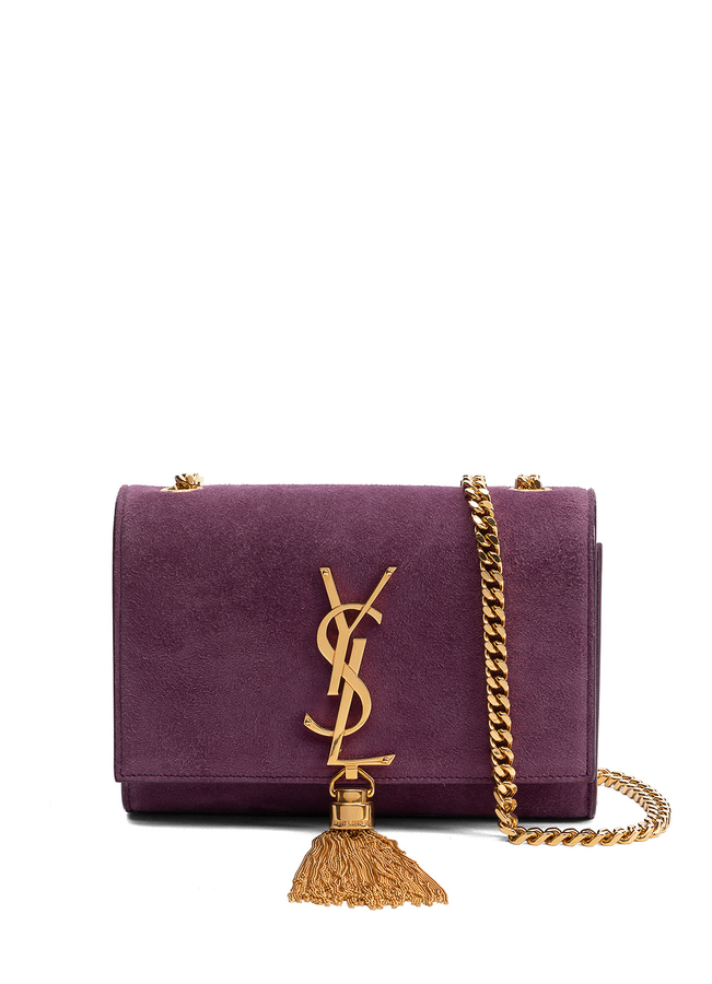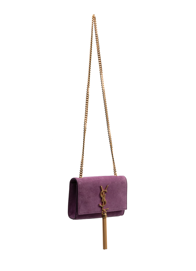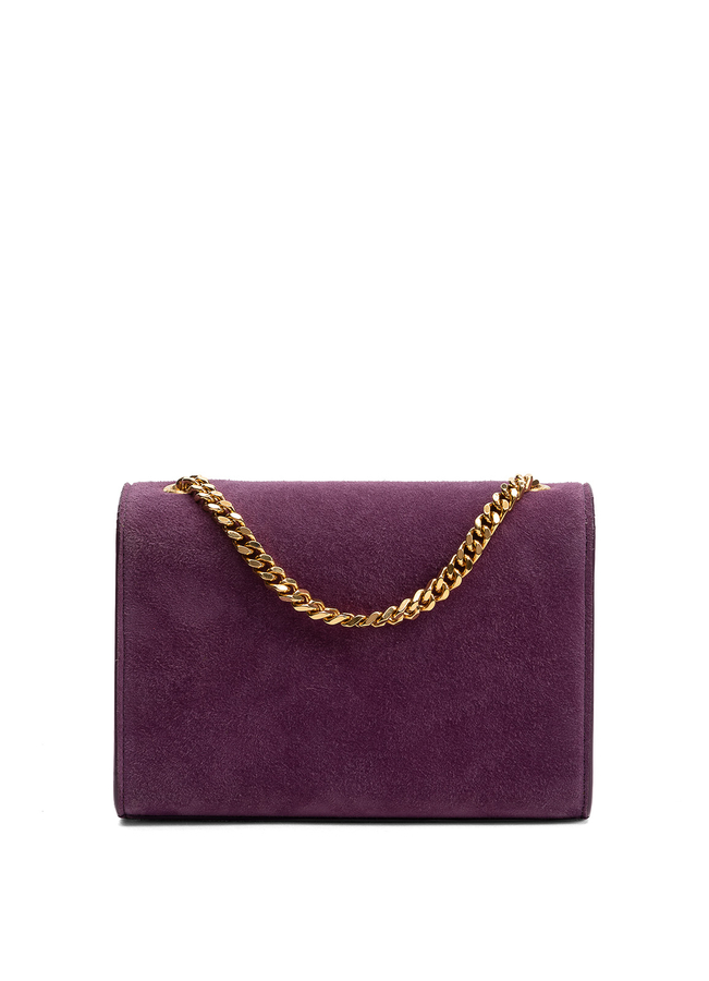 - Замшевая сумка-клатч через плечо с фурнитурой золотистого цвета. Ремешок-цепочка через плечо. Откидной клапан с застежкой на магнитный замок. Внутренний карман. Металлический логотип и кисточка из металлической цепочки.